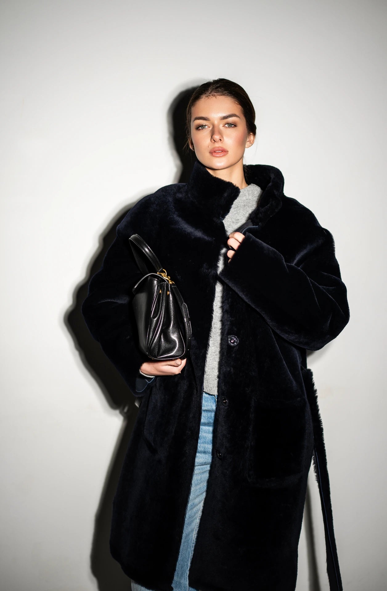 Midi-length merino shearling coat in navy